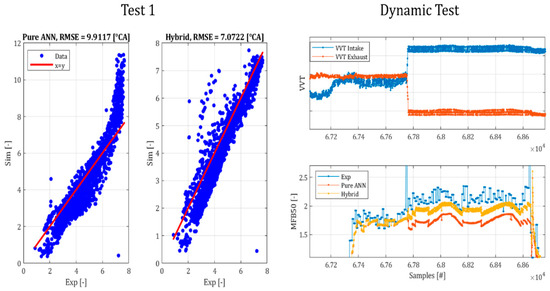 Figure 9 shows some results to demonstrate that the hybrid approach has superior extrapolation capabilities with respect to the purely ANN-based approach and why it is chosen as the final approach. The graph on the left in Figure 9 illustrates a steady-state test, named Test 1, where multiple actuations have been changed at the same time, i.e., the SA, injection, VVT, etc. Meanwhile, the graph on the right refers to a dynamic test where there was a change in the VVT (both intake and exhaust) following certain strategies of the ECU. The results are compared using the root mean square error (RMSE) index. As seen from the results, the hybrid approach captures these changes with higher accuracy with respect to the ANN-based model and can also follow the physical trend of the phenomenon. Following these results, the hybrid approach is selected for subsequent analysis. The values of the MFB50 are normalized and one unit equals 10 °CA; this criterion for the normalization of this index is implemented throughout this paper. The Y axis of the VVT graph is obscured for confidentiality reasons.