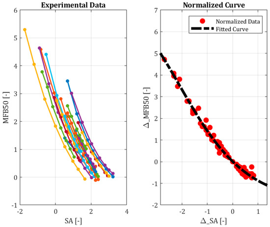 As is well known from the literature, the relationship between the SA and the MFB50 is characterized by a parabolic trend, which can be described by a second-order polynomial [21]. Taking advantage of this relationship, the SA corrective function has been developed, where the function outputs the ΔMFB50, which is a function of the ΔSA. Starting from the spark sweep data shown in Figure 3, the MFB50 and the SA axis are normalized following Equations (1) and (2).