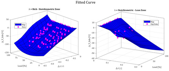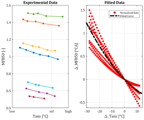 Once the data have been normalized, a single curve, namely a second-order polynomial as given by Equation (6), is fitted, which represents the relationship of ΔMFB50 with respect to Δλ over the entire operating range of the engine, as shown in Figure 10.