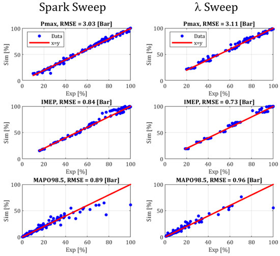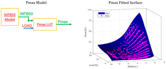 The Pmax and IMEP models take one of the inputs as the simulated MFB50, which captures the effects of different actuations/variables, and the engine load. Meanwhile, the MAPO takes as input the simulated Pmax and MFB50, along with other inputs, such as the engine speed, load, and λ. Table 7 shows the results achieved for various steady-state and dynamic/transient tests. As seen in this table, the results achieved show accuracy with an acceptable level of error, with the RMSE being within 5% with respect to the maximum value of each index.