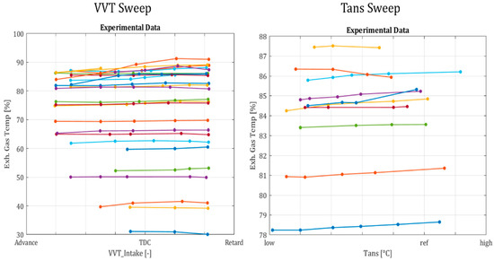 VVT and Tans sweep experimental data. Each colored line in the left graph represents a engine point (as a couple of the engine speed and engine load).