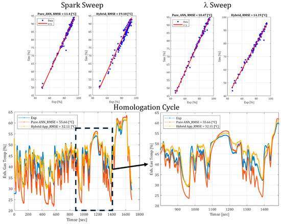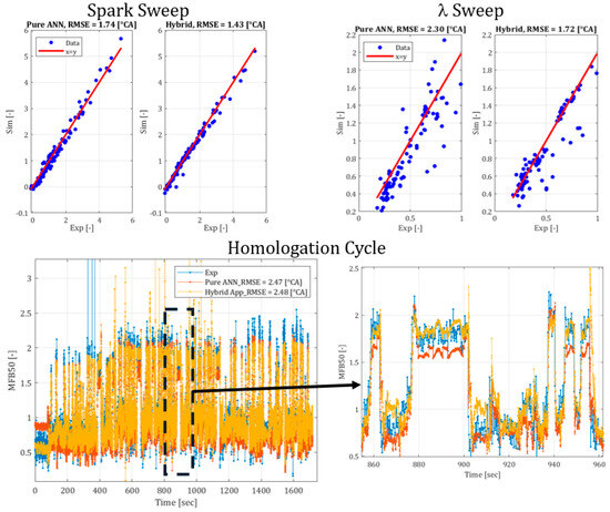 Figure 23 shows some results achieved for steady-state and transient conditions. The upper part of the figure refers to the steady-state result, which shows that the hybrid approach has slightly higher accuracy than the pure ANN model. Meanwhile, the lower part of the graph refers to the results obtained for the MFB50 during a homologation cycle, as represented in Figure 6. The lower-left plot in Figure 21 refers to the results during the complete cycle, whereas the lower-right plot is a magnified version of this complete cycle. As can be seen, the yellow line (referring to the hybrid approach) is almost always able to closely follow the experimental signal (blue line), which is not the case with the pure ANN model (red line).