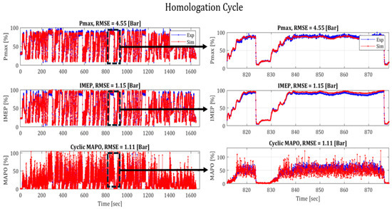 Meanwhile, Figure 25 shows the results achieved for a homologation cycle; the left graph shows the complete cycle, while the right graph shows the magnified version. For these dynamic/transient tests, the knock model evaluated the cyclic MAPO by extracting the logarithmic random values using the µ and σ simulated by the ANN model, which reflected the same probability distribution as the measured values of the MAPO.