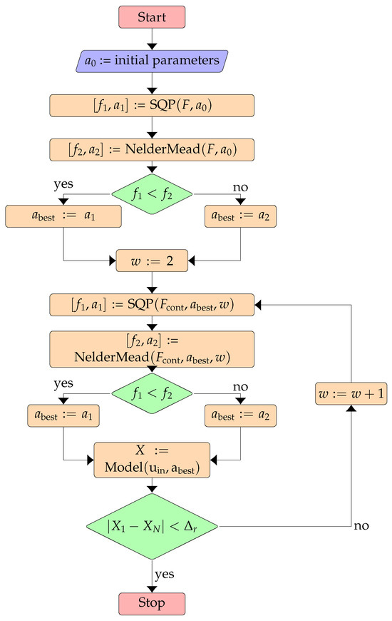 The optimization process involves initially minimizing the objective function (14) using both algorithms, selecting parameters with the lowest value of this function, then minimizing the function (17) using both algorithms, with parameters obtained in the first stage of minimization, and finally selecting parameters for which the objective function value is the smallest, while simultaneously checking whether the internal variable of the function remains continuous and periodic. A simplified block diagram of the optimization algorithm is shown in Figure 2. Box constraints for individual parameters are presented in Table 1.