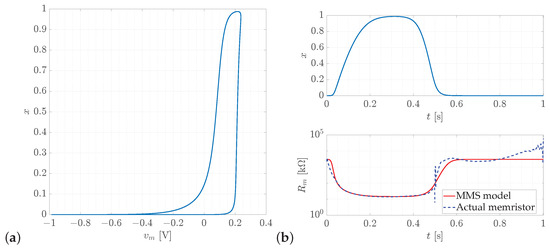 For the simulation and integration of the MMS model, the Runge–Kutta method called “RK4” is implemented independently in MATLAB [16,27]. To ensure that the model represents the parameters of a memristor, and not a memristor–linear resistor circuit, the first step is to calculate the value of the internal variable. Subsequently, using the fact that the relationship is linear, the memristor conductance can be calculated, as in Equation (6). The voltage is then calculated using a voltage divider , where represents the resistance of the series resistor. Subsequently, the memristor current is the product of the voltage and the conductance .