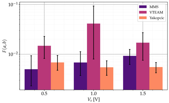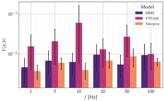 Figure 10 depicts the average objective function values for each model as a function of the frequency of the supply voltage applied to the memristor–resistor system. It is immediately evident that the VTEAM model exhibits the highest objective function values, accompanied by a significant dispersion, as indicated by the error bars. In contrast, the MMS and Yakopcic models demonstrate a reduced dispersion of the results and considerably lower average objective function values. In particular, the Yakopcic and MMS models exhibit lower objective function values within the lower frequency range.