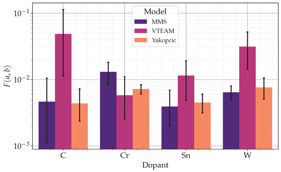 Figure 11 presents the average values of the objective function for each model as a function of the doping material used. It is evident that for the MMS model, the lowest average objective function values are observed for tin and carbon doping, while the highest value corresponds to chromium doping. Similarly, the Yakopcic model exhibits the lowest objective function values for carbon and tin doping, with the highest value associated with tungsten doping. In the VTEAM model, the highest values are obtained for carbon doping and the lowest values are obtained for chromium doping.