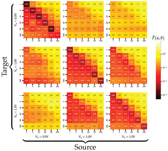 In Figure 13, an exemplary heatmap is presented, displaying the objective function values for the evaluation of model parameters obtained through optimization for different excitation parameters. As can be observed, the lowest values of the objective function are located along the diagonal of the matrix. This is because these are the objective function values for the parameters for which the optimization is performed. The values in the upper right corners of the matrix are the highest. These are the regions where the objective function values are evaluated for the most divergent excitation parameters from those used during the optimization process. From the presented graph, it can be concluded that the parameters of the MMS models do not generalize the dynamics of memristors for all operational conditions. An interesting aspect is the significantly higher accuracy of the model when it is optimized at higher excitation frequencies and evaluated at lower frequencies, rather than the other way around.