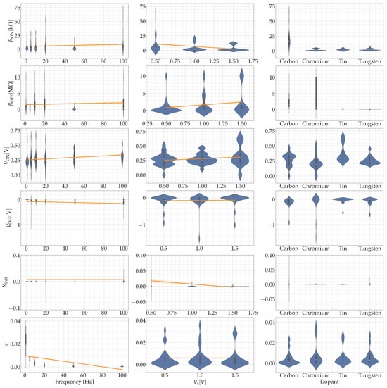 In Figure 14, a matrix of plots is presented, showing the variation in MMS model parameter values (Y-axis) with linear trend lines, depending on the doping of the memristors and excitation parameters (X-axis). As can be observed, the optimized parameters of the MMS model change quite drastically depending on the excitation signal parameters (in this case, the parameters of the alternating supply voltage). This requires adjusting the model parameters during simulation according to the intended signal.