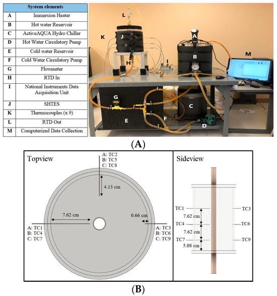 All experiments were conducted under controlled room conditions, maintaining a constant temperature of 21 °C as monitored by a digital indoor thermometer. To monitor the temperature within the silica sand, a total of nine K-type thermocouples were placed within the container. These thermocouples featured a 0.318 cm (0.125 in.) diameter, a stainless steel cover, and an uncertainty of ±0.5 °C. They were arranged in three vertical sets, evenly spaced around the central pipe. TC1, TC4, and TC7 were positioned 7.62 cm (3.0 in.) from the outer wall of the container. TC2, TC6, and TC8 were located 4.13 cm (1.625 in.) from the outer wall of the container, while TC3, TC6, and TC9 were situated at a depth of 0.66 cm (0.26 in.) inside the container. For visual reference, please consult Figure 2B to view the precise locations of these thermocouples within the container.