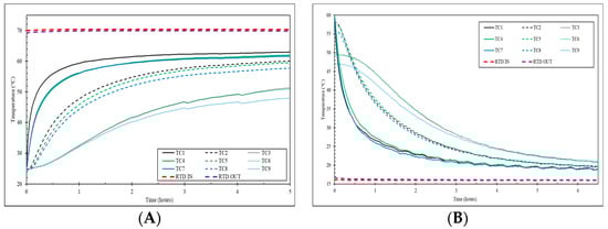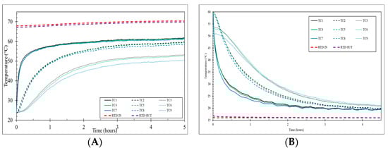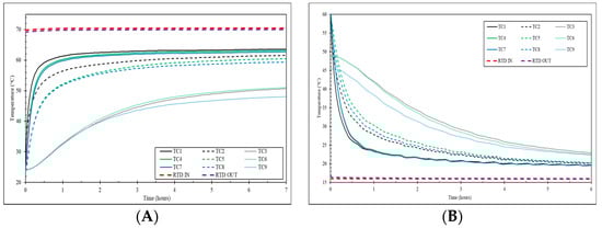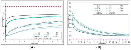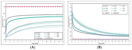 In Figure 9A, we can observe that the temperature distribution of sand for the configuration 1b during the charging process closely resembles that of configuration 1a, albeit with a quicker response owing to the increased interfacial surface area due to the higher number of fins. In this figure, it is notable that all thermocouples positioned near the fins reach the temperature plateau within the initial hour of charging, while those located farthest from the heat transfer surface require more time to attain the final temperature. This same pattern is observed during the discharging process, as depicted in Figure 9B.