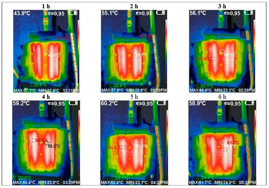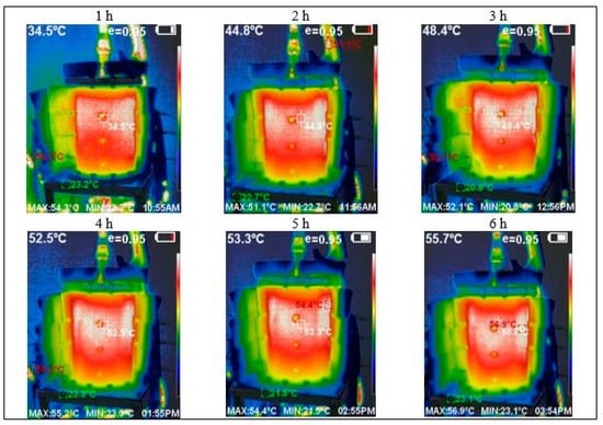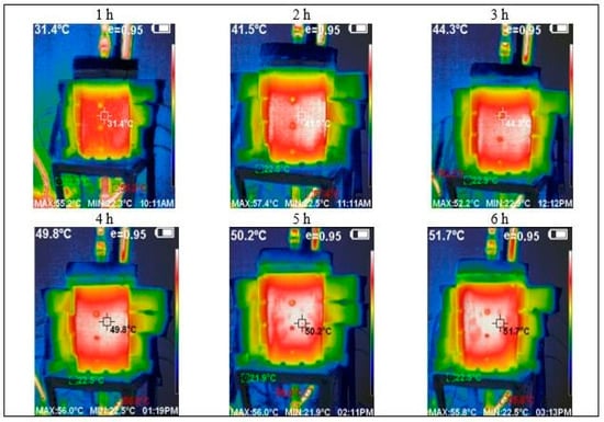 For a more comprehensive view of the thermal behavior of the system, the thermal images taken during the charging process for configuration with 20 annular fins are illustrated in Figure 10.