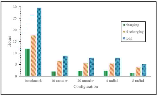 The total charging and discharging durations for annular configurations, with a percentage decrease compared to the benchmark case.