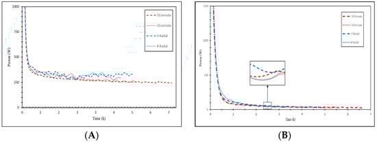 In the case of finned configurations, as depicted in Figure 16A,B, a notable trend is observed where an increase in the number of fins, both in the annular and radial designs, enhances the power supply to the system during the charging process. The presence of fins results in significantly higher initial heat transfer rates at the commencement of charging and discharging operations. This facilitates quicker charging and discharging of the system. The finned setups deliver a greater amount of thermal power to the sand within the initial hours of the charging process compared to the benchmark. In Figure 16A, it is evident that eight-radial-fin configuration, which achieved the quickest charging time, absorbs more thermal energy within the first hour when compared to all other configurations. This behavior is also observed during the discharging process of configuration 2b, where it releases a larger amount of thermal energy within the first two hours, resulting in the shortest discharging duration, as demonstrated in Figure 16B.