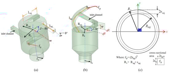 Figure 2c shows, in top view, the main radius for both atomizers (where ). It should be noted that in the present work, it has been considered that all the inlet channels are square in section with side :