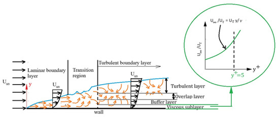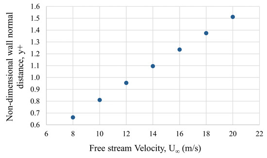 For grid independence and the construction of the hexahedral meshes, it is necessary to consider the dimensionless wall distance (), which can be considered as a local Reynolds Number, represented by Equation (21), where “y” is the distance from the wall to the centroid of the first cell, “” is the friction velocity (Equation (22)), “” is the wall shear stress (Equation (23)), “” is the free stream velocity (), and “” is the skin friction coefficient (Equation (24)) [22]: