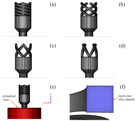 Figure 6 shows the four meshes corresponding to cases A, B, C, and D (Figure 6a–d, respectively), where it is worth noting that a lower helix angle () corresponds to a longer channel length ( mm); on the other hand, if the helix angle increases, the inlet channel length will decrease, because the number of turns in the inlet channel will depend on the helix angle (see Table 1). Figure 6e shows the general dimensions for all cases of the swirl chamber, the height of the helical channels, and the cylindrical region for the visualization of the spray angle (). In addition, to consider the effects of the boundary layer, an adequate refinement in the areas close to the walls was taken into account (Figure 6f).