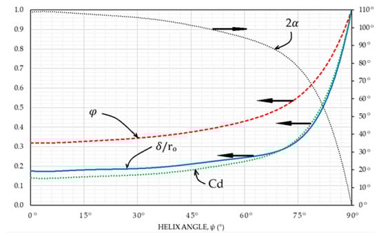 Film flow area coefficient (), adimensional parameter (), discharge coefficient (), and spray angle (), as a function of helix angle (), assuming ideal flow.