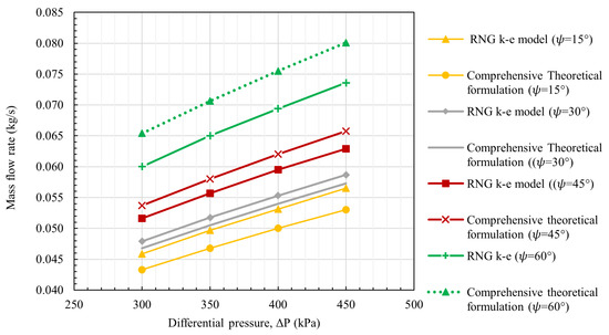 In Figure 8, the results of mass flow rates obtained from the comprehensive theoretical formulation are compared with the results of the numerical simulation (RNG k- model) in a steady state for four differential pressures (: 300, 350, 400, and 450 kPa) per case of helix angle (). It is evident that the theoretical formulation provides the maximum errors (8.789%) when compared to the numerical simulation results for case (), as demonstrated in Table 5.