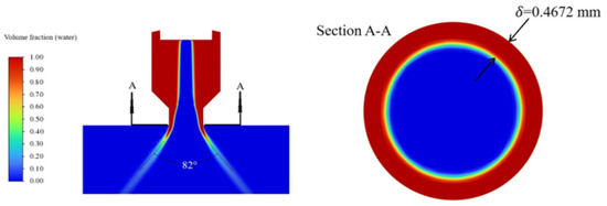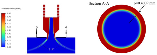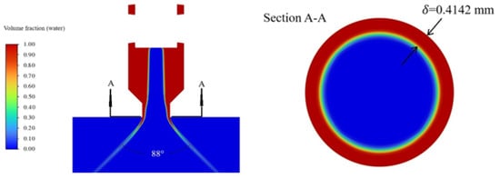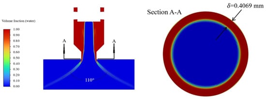 Left side: Visualization of spray angle (); right side: liquid film thickness at orifice discharge (), from and .