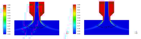Finally, in Figure 7, we can see that the spray angle tends to decrease with the increase of the helix angle . From onwards, a very abrupt drop in the spray angle is evident, where it can be confirmed that when the helix angle reaches the value of , the spray angle closes until it reaches zero.