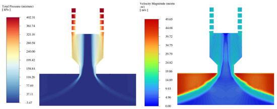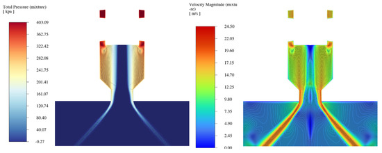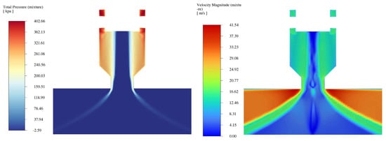 Figure 15 shows the total pressure contour (left side) and the total velocity contour (right side), in the vertical plane of atomizer B (), where the total pressure assumed in the inlet conditions is the “pressure inlet”: 400 kPa. In this atomizer, the behavior of the internal flow is similar to that of atomizer A (), except in the upper part of the swirl chamber, where it can be seen that the water liquid ejected by the helical channels creates vortices at the top of the swirl chamber, because the inclination of the helix angle begins to gain importance.