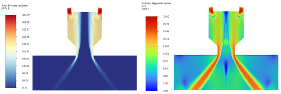 (Left side): Contours of total pressure (kPa); (Right side): Contours of total velocity (m/s) from atomizer B ( and ).