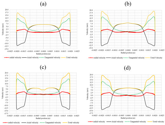 The numerical simulation comprises four values of inlet pressure (300, 350, 400, and 450 kPa) for each case (A, B, C, and D). These pressures allow determining the inlet velocity, facilitating the calculation of the turbulent intensity (I); it is worth noting that the turbulent intensity () [19] and the hydraulic diameter () were particularly used for low Reynolds models (Re ) [26]. Then, using these criteria in the RNG k- turbulence model [27], convergence was successfully achieved for all cases. The RNG k- model was chosen for this work because it considers swirl or rotation effects, modifying the turbulent viscosity appropriately [28]; in addition, it handles flows with low Reynolds number near walls [29].