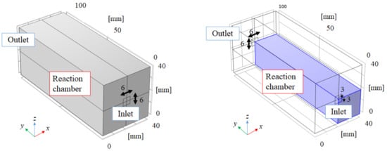 Figure 1 illustrates the overview of the 3D model. Figure 2 illustrates the front view of the 3D model. The 3D model simulates the experimental apparatus of the reaction chamber used for the previous experimental studies carried out by the authors [5,18]. Though the BDR experiment was carried out using a membrane reactor in the previous studies [5,18], this study focuses on the reaction chamber only without H2 separation to clarify the reaction characteristics of biogas dry reforming including the other reactions. The dimensions of the 3D model are 40 mm × 40 mm × 100 mm. This study has adopted the dimensions of the 3D model of 40 mm × 40 mm × 100 mm for the numerical simulation following the experimental studies conducted by the authors [5,18]. In this experimental study, the diameters of the inlet and outlet of the reactor were 6 mm. Therefore, this study has set the area of 6 mm × 6 mm as the area of the inlet and outlet of the full-scale model.