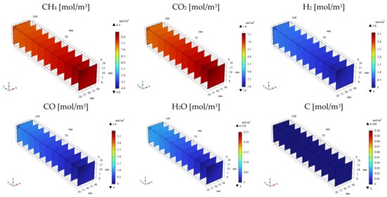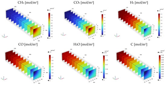 3D distribution of molar concentrations of CH4, CO2, H2, CO, H2O, and C in the reactor (εp = 0.95).