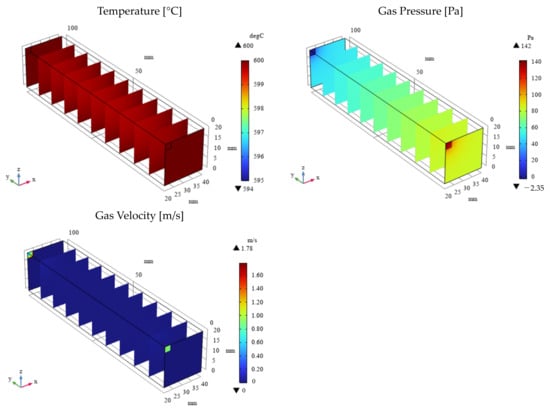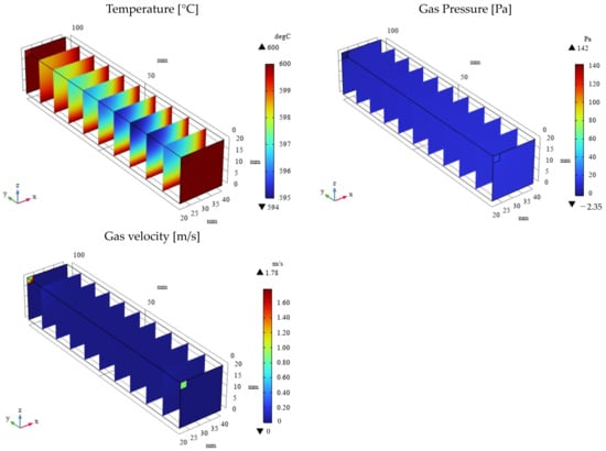 3D distribution of temperature, gas pressure, and gas velocity in the reactor (εp = 0.95).