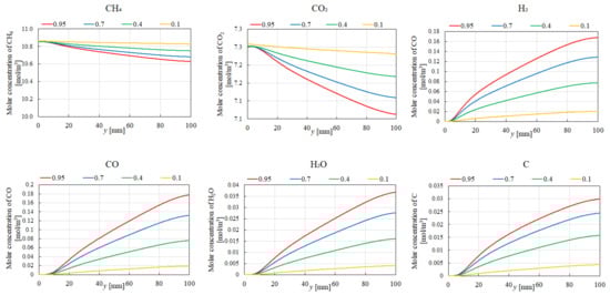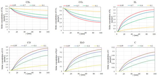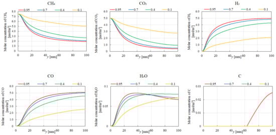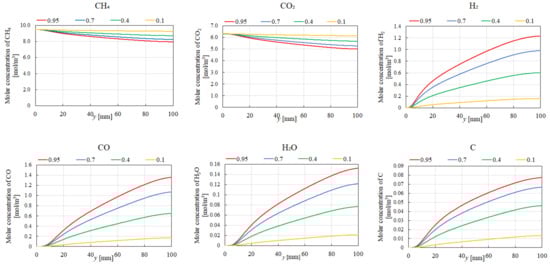 Figure 7, Figure 8, Figure 9 and Figure 10 illustrate the influence of εp on the distribution of molar concentrations along the reactor centerline for CH4:CO2 = 1.5:1 at various reaction temperatures (400 °C, 500 °C, 600 °C, and 700 °C). εp is changed by 0.95, 0.7, 0.4, and 0.1. The results demonstrate that increasing εp leads to a decrease in the molar concentrations of CH4 and CO2 while simultaneously enhancing the concentrations of H2, CO, H2O, and C. This enhancement is attributed to the improved mass diffusion within the porous catalyst structure, facilitating the progress of the reforming reactions. Moreover, elevating the reaction temperature promotes the formation of H2 and CO, as evidenced by the increased molar concentrations of these species. The enhanced performance of DR, SR, RWGS, and MR, as described by Equations (1)–(4), at a higher reaction temperature contributes to the observed H2 and CO production. In addition, according to Figure 7, Figure 8, Figure 9 and Figure 10, the molar concentration of C for εp increases along the y-direction at 400 °C and 500 °C. On the other hand, we cannot see the production of C for εp along the y-direction at 600 °C and 700 °C. The authors think BD (Equation (6)), which is an exothermic reaction, produces C from CO at a lower reaction temperature after CO is produced by DR (Equation (1)), SR (Equation (2)), and RWGS (Equation (3)).