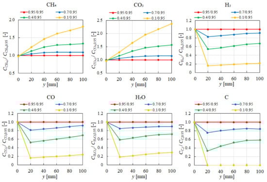 Figure 11 quantitatively evaluates the influence of εp on the distribution of the molar concentration ratios for each gas along the reactor centerline under the condition of CH4:CO2 = 1.5:1 at 600 °C. The analysis reveals that the impact of εp on the molar concentration distribution becomes more pronounced as εp increases, regardless of the gas species. Notably, the effect of εp on the products species (H2, CO, H2O, and C) is more significant near the inlet (y = 20 m). In addition, it can be seen that the effect of εp on the reactant species (CH4 and CO2) is more pronounced near the inlet (y = 20 m), e.g., in the case of 0.1/0.95, which is similar to the tendency of products species. This observation can be attributed to the gradual consumption of CH4 and CO2 through the various reactions (Equations (1)–(5)) along the gas flow. The enhanced diffusivity within the porous catalyst at higher εp values contributes to the more significant impact on reactant concentrations near the outlet. Moreover, it is revealed in Figure 11 that increasing εp from 0.1 to 0.95 significantly provides a five times increase in H2 production.