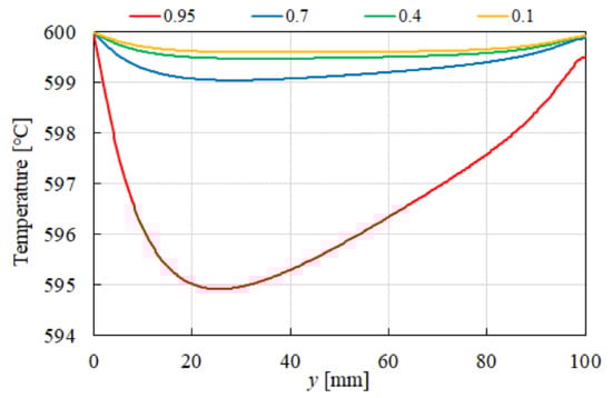 Figure 12 illustrates the influence of εp on the distribution of temperature for CH4:CO2 = 1.5:1 at 600 °C. As depicted in the figure, a larger temperature drop is observed near the inlet (y = 20 m) with increasing εp. This phenomenon is attributed to the dominance of the endothermic reactions represented by Equations (1), (2), (3) and (5), which absorb heat from the surrounding, leading to a localized temperature decrease.