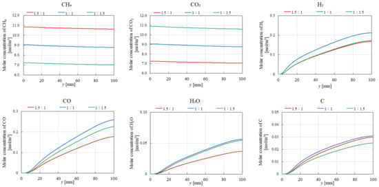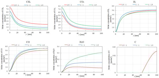 Figure 13 and Figure 14 compare the distributions of the molar concentration for different molar ratios of CH4:CO2 at 400 °C and 700 °C, respectively, with εp = 0.95. The results indicate that the highest molar concentrations of CH4 and CO2 are achieved at CH4:CO2 = 1.5:1 and 1:1.5, respectively, regardless of the reaction temperature. This is primarily attributed to the higher inflow rates associated with these ratios. Additionally, the highest molar concentrations of H2 and CO2 are consistently observed at CH4:CO2 = 1:1, irrespective of the reaction temperature, aligning with the theoretical molar ratio for DR.