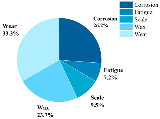 The production journal indicates that five kinds of faults including scale, wax, corrosion, fatigue, and wear account for about 90% of all faults, which are the main reasons for oil well maintenance operations. The classification and statistics of five fault causes are shown in Figure 1 as follows: corrosion (26.2%), fatigue (7.2%), scale (9.5%), wax (23.7%), and wear (33.3%).