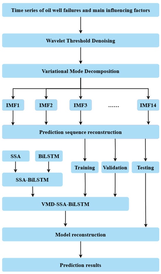 Variational mode decomposition (VMD) and wavelet threshold denoising were employed to reduce the proportion of data noise. Variational mode decomposition can decompose time series data into a series of intrinsic mode functions (IMF). Sparrow search algorithm (SSA) was used to optimize the bidirectional long short-term memory (BiLSTM) networks model. As a result, the intelligent model of fault prediction in the rod pumping system was constructed. The process of fault prediction based on VMD-SSA-BiLSTM is shown in Figure 2.