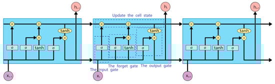 The LSTM layer is linked by a number of memory units. The interior of each unit can be divided into the forgetting gate, the input gate, and the output gate according to the function. The internal structure of the unit is shown in Figure 3 (Please refer to the following text for explanations of relevant symbols and arrows).