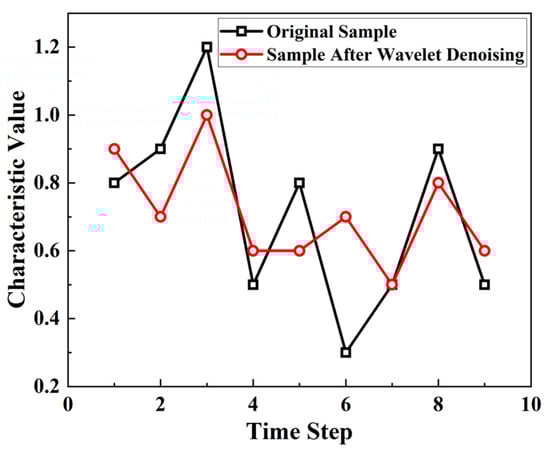 This paper selected heursure threshold principle and soft thresholding function. Based on the data characteristics of each fault, coif4, bior6.8, db3, sym8, and db4 were used as wavelet basis functions. The statistical data contained a total of 14 feature quantities, with a maximum of 90 data retained in each sample. Figure 4 shows the comparison curve of one feature data of the same sample before and after wavelet threshold denoising. The curve after wavelet threshold denoising is significantly smoother than the curve of the unprocessed data, characterizing the non-stationary data well.