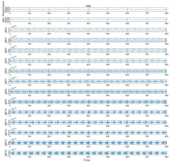 VMD can smoothen the image while preserving the detailed components of the original signal well. After multiple experiments, it was found that was set to 14, was set to 250, was set to 5 × 10−6, and was set to 0.01. At this point, the effect of VMD reached its best. Figure 5 shows a comparison image of data with a time step of 800 before and after VMD. From the decomposition diagram, it can be seen that VMD converts the initial signal into non-recursive signals IMF1~IMF14, which represent the trend at different time scales and frequency ranges. It is the variation trend at different scales that is helpful to judge the fault type.