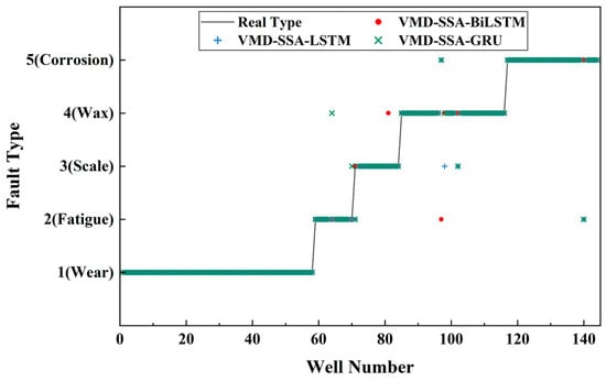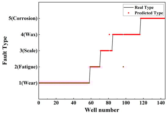 The test set was put into the trained model to test its effectiveness. Figure 6 shows the comparison curve between the model fault prediction results and the actual results. To render the results more effectively, this paper categorized and ranked the test well samples based on their fault types before generating the visualization. It could be seen from the figure that the two curves highly overlap. Among the 144 selected test wells, 142 wells had the same test results as the actual results, with a prediction accuracy of 98.61%, indicating good testing results.