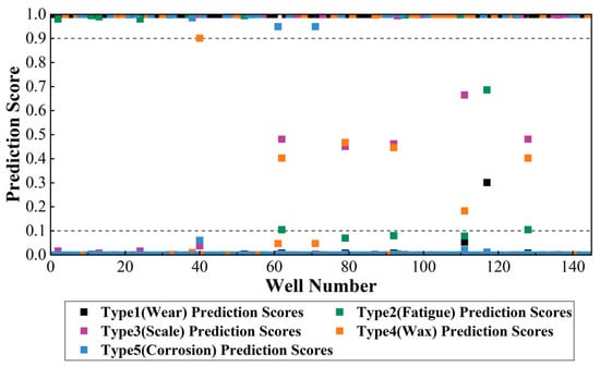 In addition, for reasons of analyzing the influence of the randomness of the test set on the prediction accuracy, the prediction score is used to further evaluate the prediction effect of the model. The value of the prediction score represents the probability that a fault that will occur in a certain well is predicted to be this type of fault, and the sum of prediction scores of the five types of faults in each test well is 1. As shown in Figure 8, among the 144 test wells, the prediction scores of a class of faults in most test wells are close to 1, which indicates that the model achieves great generalization capability and robustness.