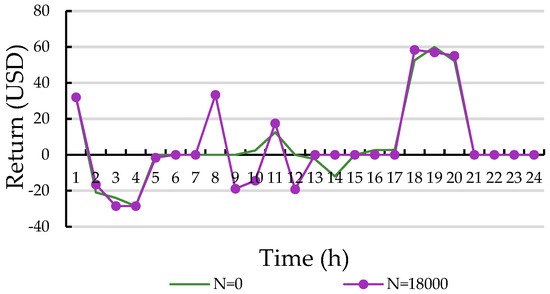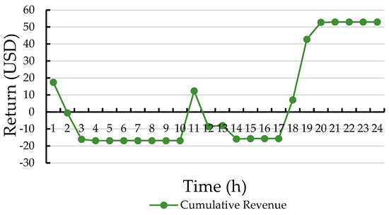 Figure 4 illustrates the cumulative revenue of the BESS. After 24 h of operation, the cumulative revenue for this single BESS exceeded USD 60, demonstrating the effectiveness of the reinforcement learning-based strategy in navigating dynamic price fluctuations. This outcome highlights the model’s ability to capitalize on price arbitrage opportunities, validating its robustness in optimizing BESS performance under varying market conditions.