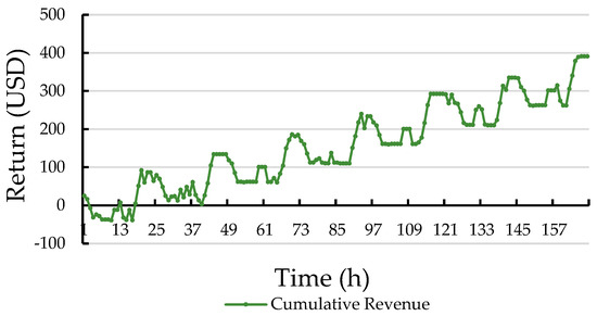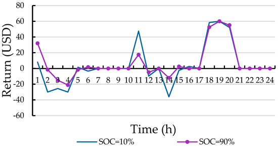 The results demonstrated in Figure 8 represent that the BESS with an initial SOC of 90% achieved significantly higher cumulative revenue over the 24-h period, exceeding USD 150. Although both systems followed similar charging and discharging trends, the higher SOC system was better positioned to capitalize on price fluctuations during peak periods, leading to superior overall revenue. This indicates that a higher initial SOC enables the system to more effectively exploit market opportunities, particularly during periods of elevated electricity prices, resulting in enhanced financial performance.