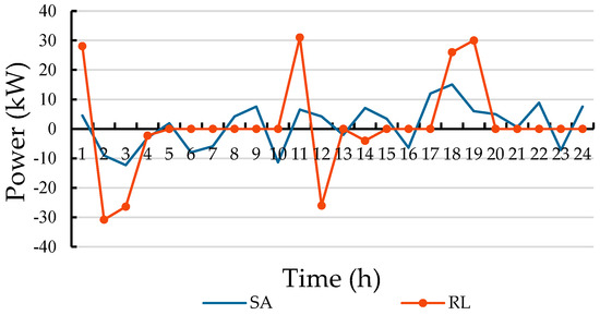 The power dispatching profiles illustrated in Figure 9 reveal distinct operational strategies between the RL and SA algorithms. The RL approach demonstrates a more aggressive charging and discharging pattern, characterized by higher power fluctuations and more pronounced peaks. This is evident in the substantial charging activities during hours 2–3 and the significant discharging events in hours 12–13 and 18–20. In contrast, the SA algorithm exhibits a more conservative approach with smoother power transitions. The RL algorithm’s propensity for exploiting extreme price differentials is apparent, suggesting a higher sensitivity to market dynamics.