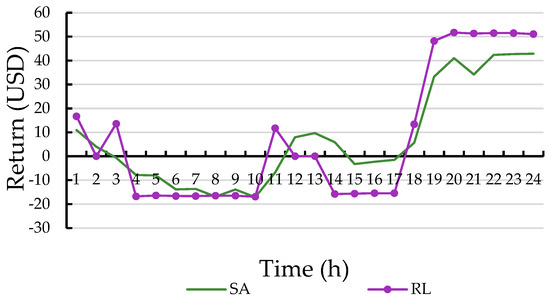 Figure 10 provides crucial insights into the cumulative revenue performance of both algorithms. While the revenue trajectories of the RL and SA algorithms show similar trends for the majority of the 24-h period, a notable divergence occurs from hour 18 onwards. The RL algorithm’s cumulative revenue experiences a sharp upward trajectory, maintaining a substantial lead over the SA algorithm for the remainder of the simulation. This performance disparity culminates in a significantly higher total revenue for the RL approach by the end of the 24-h period. The superior economic outcome of the RL algorithm underscores its enhanced ability to capitalize on market opportunities, albeit potentially at the cost of more aggressive battery utilization, which warrants further investigation into long-term operational implications.
