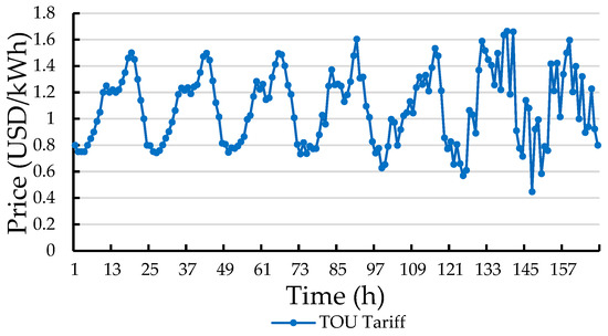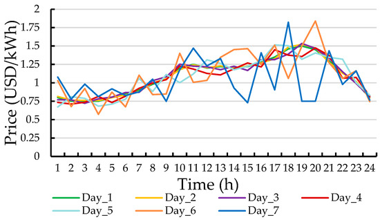 To validate the model’s robustness and adaptability, we conducted a seven-day multi-scenario simulation featuring progressively increasing electricity price volatility. This test highlights the model’s ability to adjust charging and discharging strategies dynamically, maintaining optimal performance across diverse market conditions. Figure 11 and Figure 12 illustrate the seven daily TOU tariffs and the overall TOU tariff, respectively.