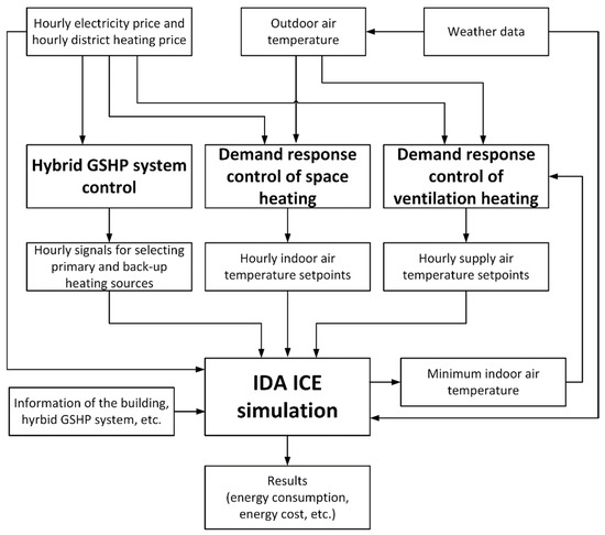 Figure 1 illustrates a flow chart describing the simulation process. The main input parameters to the IDA ICE model include weather data, energy prices, and information of the building and the hybrid GSHP system. Apart from these, there are three control strategies used in this study: hybrid GSHP system control, DR control of space heating, and DR control of ventilation heating. The hybrid GSHP system control is used to determine whether the GSHP or DH is used for primary heating. DR control of space heating selects the indoor air temperature heating setpoint. DR control of ventilation heating is used for modulating the supply air temperature heating setpoint. By receiving the input parameters and control signals from the control algorithms, IDA ICE carries out the simulation and compute final results.