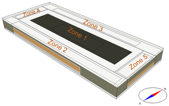 The building used for this study is a large educational building complex located in Espoo, Finland. It features an irregular shape and comprises five floors. The building contains various functioning spaces, including restaurants, office rooms, cafeterias, educational spaces, supermarkets, shops, and a metro station. The building’s heated net floor area is 47,500 m2. The building layout was modelled by using a rectangular and single-story layout with a height of 4.6 m for all rooms. The interior space was divided into five zones. To match the real net floor area, the size of the building model was scaled by a factor of 18.3. The diagram of the simplified building model is illustrated in Figure 2. Information about the building’s construction details is provided in Table 1. The building was designed by a Finnish consultancy company in Espoo, Finland in compliance with the Finnish building code [40]. The validation of the simplified building model was performed in a prior study [33].
