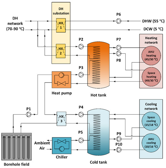 The heating and cooling are both supplied by the hybrid GSHP system, comprising a borehole field, heat pumps, a DH substation, a chiller, and cold and hot water storage tanks. The hybrid GSHP system was modeled in the IDA ICE plant model. A simplified schematic diagram of the hybrid GSHP system model is shown in Figure 3. A hot tank, heated by the heat pump or the DH, provides hot water to the heating network. A cold tank, cooled by borehole free cooling or the air-cooled chiller, supplies cold water to the cooling network. Additionally, the DHW is directly heated via the DH network.